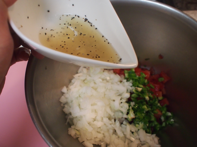 サルサソースの出来上がり!混ぜ合わせたら冷蔵庫へ入れておく。