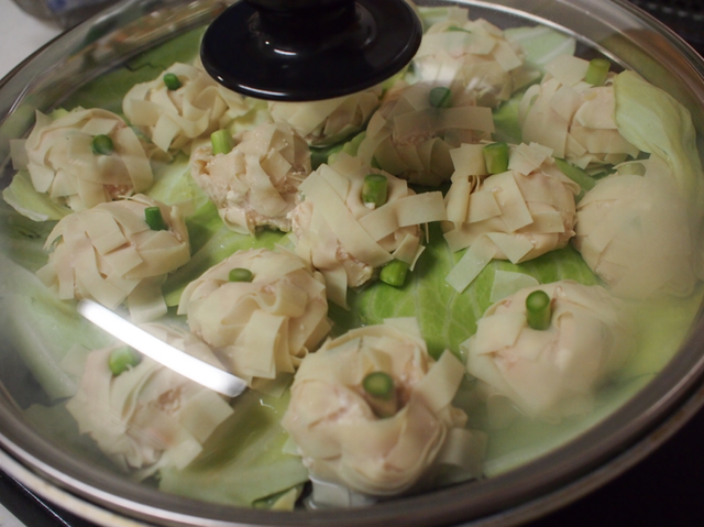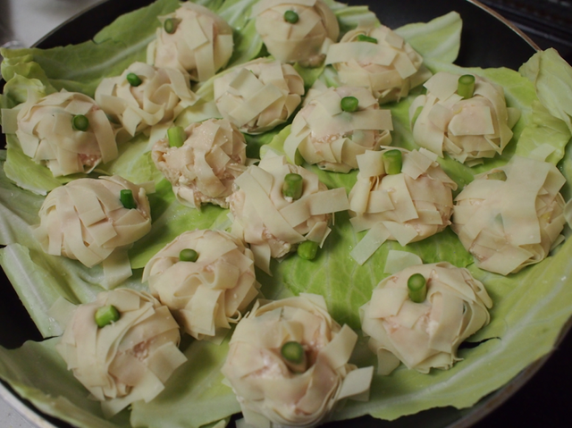 キャベツをしくのがコツ!フライパンで蒸し焼きするだけで簡単に作れる『ふんわり豆腐シュウマイ』の作り方