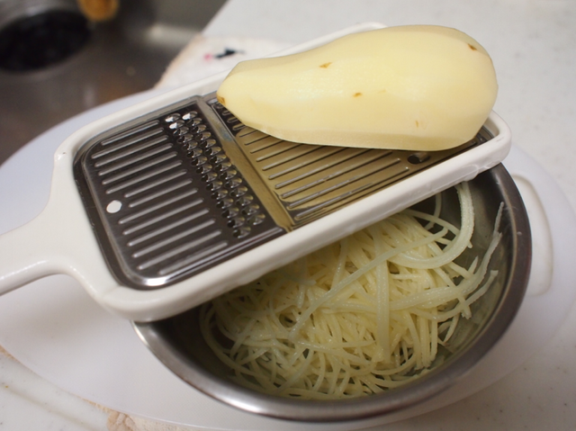 スラーサーで千切りにしたメイクイーンを水にさらさずフライパンで焼く。