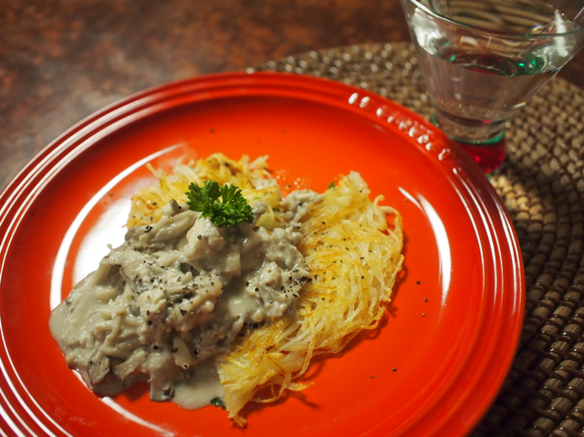 カリカリに焼けたポテトに、きのこのゴルゴンゾーラソースを掛けたら完成!