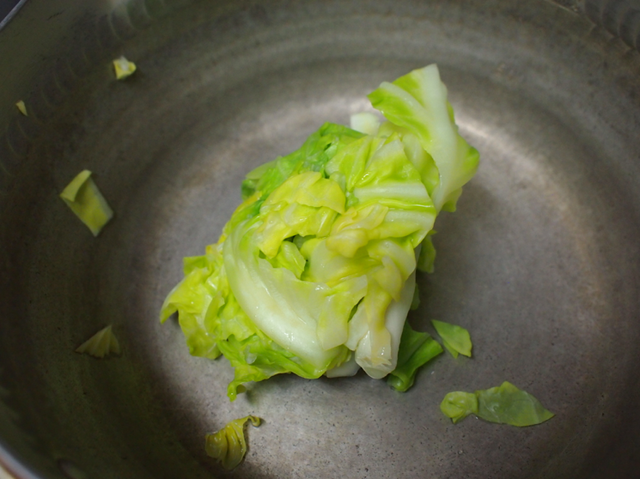ザルにキャベツを乗せて、沸騰させたお湯を回しかける。