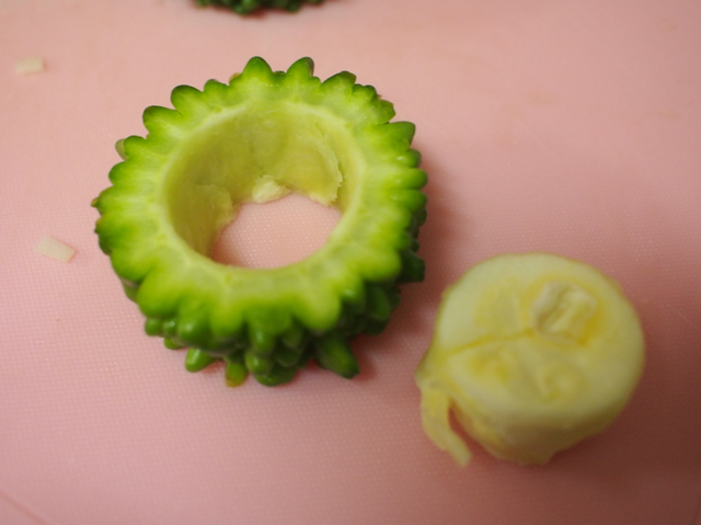 輪切りにして中の種の部分をスプーンなどでくり抜く。