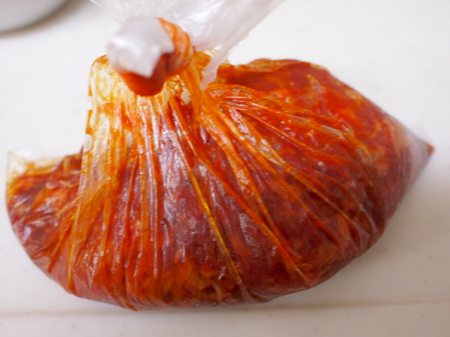 袋の中に、牛肉・酒・しょうゆ・砂糖・にんにく・コチジャン・ごま油を入れて軽く揉み、