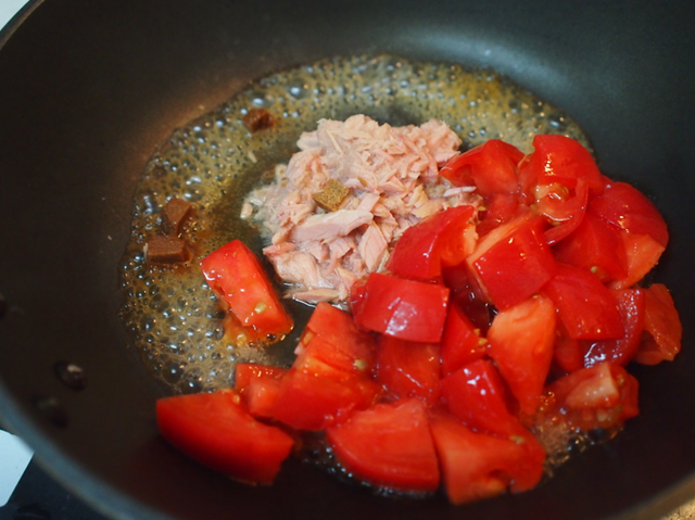 熱したフライパンにツナ缶とざく切りにしたトマト、コンソメキュープを入れて煮詰める。