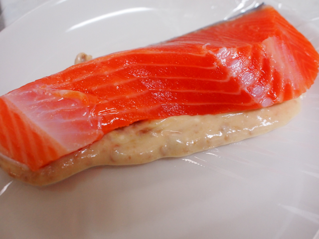 ヨーグルトと味噌を混ぜた床に漬けて焼きます。