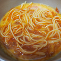商品に記載されている茹で時間で茹でた麺をソースの中に入れる。