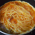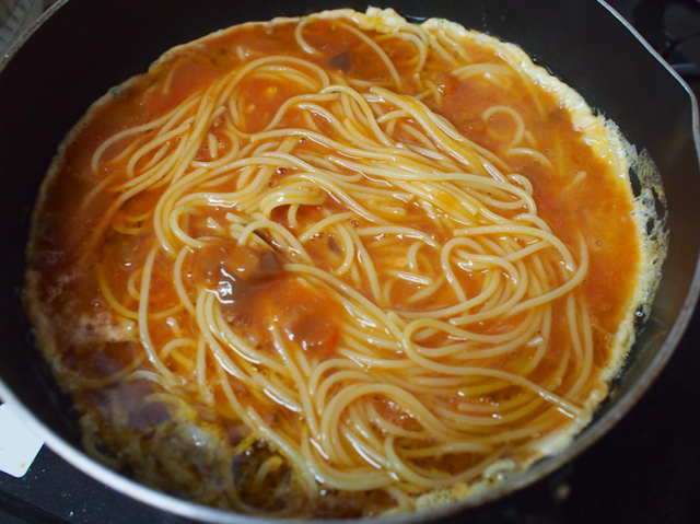 トマトソースが絡んだ麺に、卵3個とよく溶いて入れる。