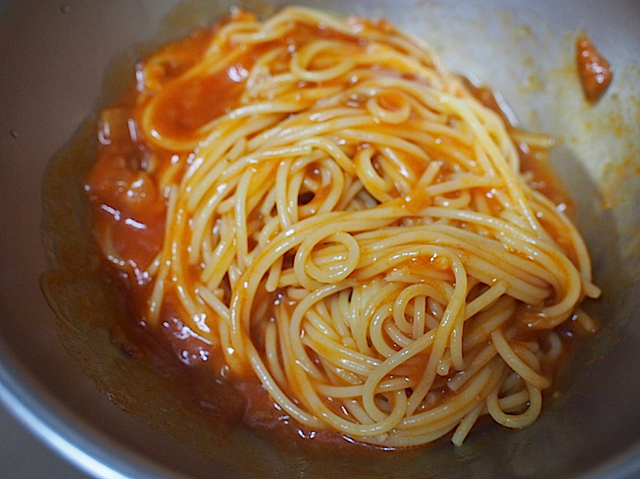 レトルトのパスタ用トマトソースを常温のまま、ボウルに開ける。