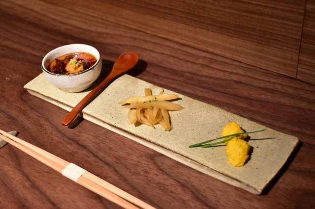先付けの「おぼろ豆腐 雲丹(ウニ) 鼈甲(べっこう)餡 布海苔」と、前菜の「ホワイトアスパラのキンピラ」、「銀杏のミモレットまぶし」がそろって登場。丁寧な仕事に期待が高まります。