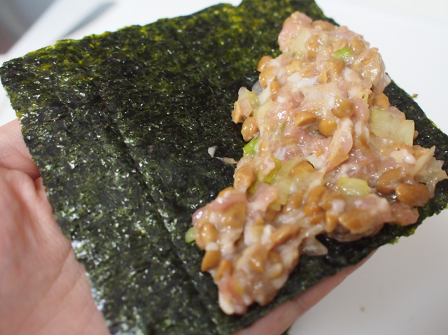 焼き海苔1枚を4等分にして、対角線反面によく混ぜた具をのせて半分に折る。