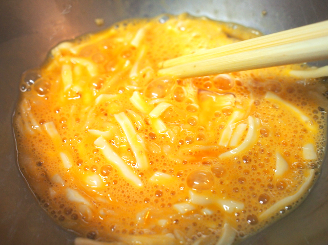 油をひき、熱した卵焼きパンで厚焼き卵のように焼いていく。