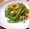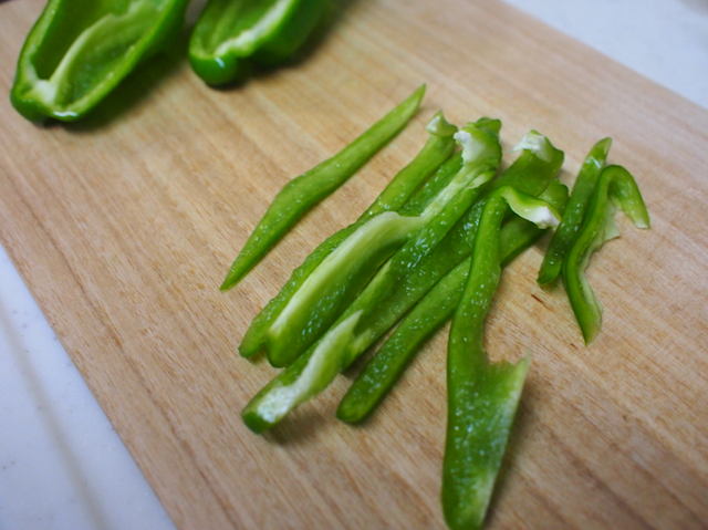 少量の油をひき、熱したフライパンに細切りにしたピーマンを入れる。