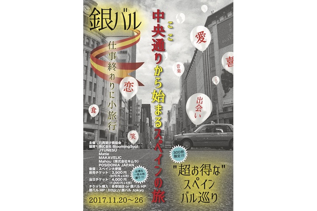 スペインレストラン・スペインバルに限定したスペイン本場のバル巡りイベント「銀バル」が、2017年11月20日~26日までの7日間限定で、東京・銀座にて開催されます。