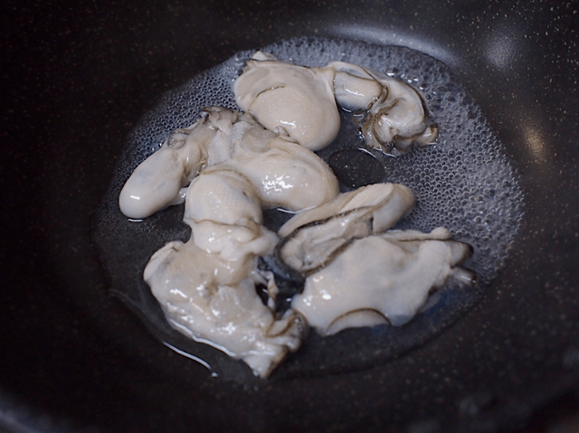 加熱したフライパンに牡蠣と分量外の酒を大さじ1程入れ、軽く塩振って焼く。