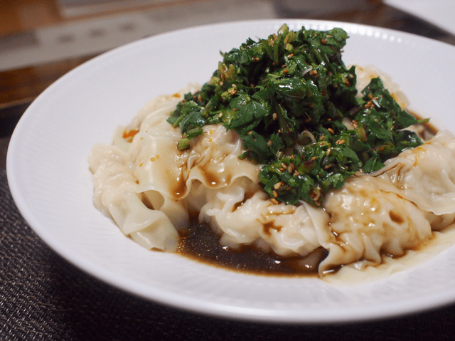 ぷるぷるのワンタンに黒酢ソース、大好きなパクチーも入れて病みつきの海老雲呑の完成です。