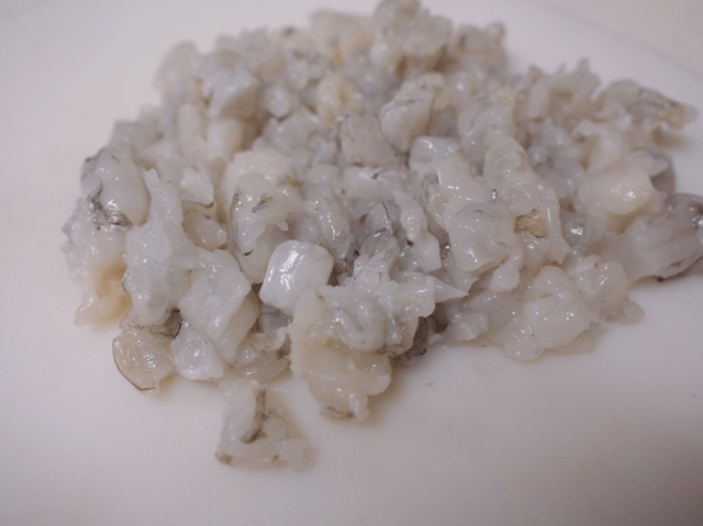 皮をむき、背ワタ腹ワタを取った海老を粗みじんにする。