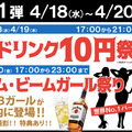ドリンク10円祭りは、4月18(水)~4月20日(金)の期間に開催。ちなみに20日は、ジム・ビームガール祭りとして、店内にジム・ビームガールが登場するとのことです。