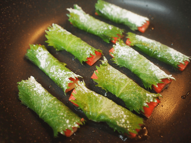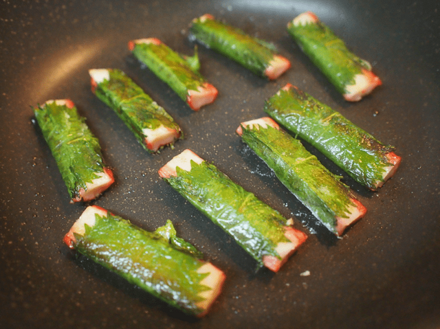 ① カニカマを大葉で巻く。