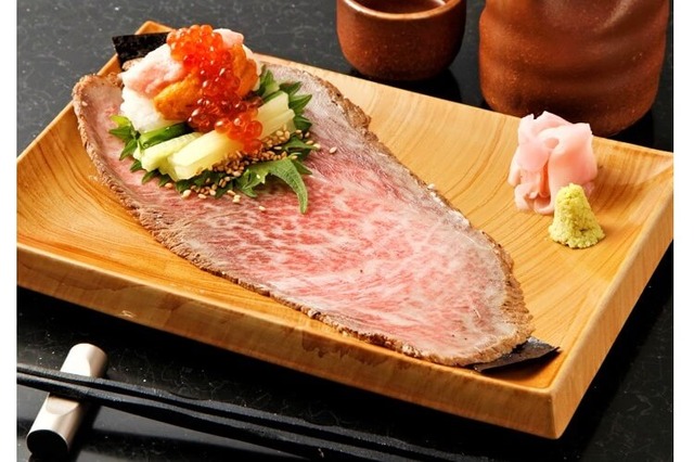 それは松阪牛×マグロのコラボメニュー。日本三大和牛のひとつ『松阪牛』と『ねぎとろ』が一緒に口の中でとろける新食感!さらにイクラで塩味を足し、雲丹が風味を加え、たくあんが食感を与え、ゴマと紫蘇の香りが食欲を刺激する計算された美味しさなのです!