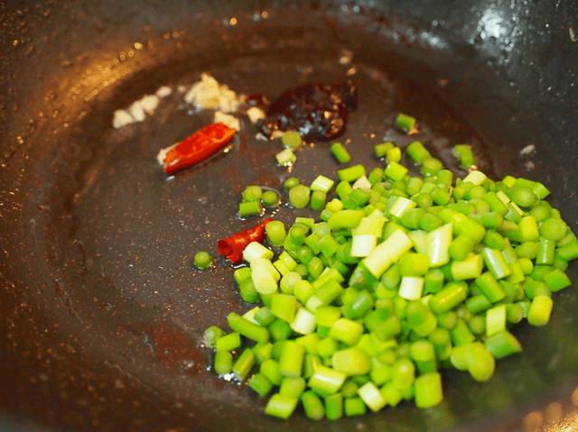 ひき肉を取り出したフライパンに油少し、豆豉・鷹の爪。ニンニクのみじん切りを入れる。
