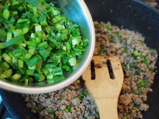 ④ ニラを入れて仕上げる。