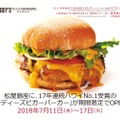 | 取扱メニュー/価格 | <松屋銀座限定>スーパーハワイアンバーガー 1,100円(1,188円)、セット 1,600円(1,728円) ※1日20食限定 •プレミアムオリジナルバーガー 850円(918円)、セット 1,350円(1,458円) •プレミアムチェダーチーズバーガー 950円(1,026円)、セット 1,450円(1,566円) ※セットにはフライドポテト、ドリンクが付きます。 |