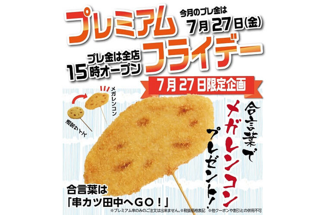 串カツ田中は、2018年7月27日(金)のプレミアムフライデー当日に、ほぼ全店を15時オープンとし、串カツを全品終日108円で提供するキャンペーンを実施します。