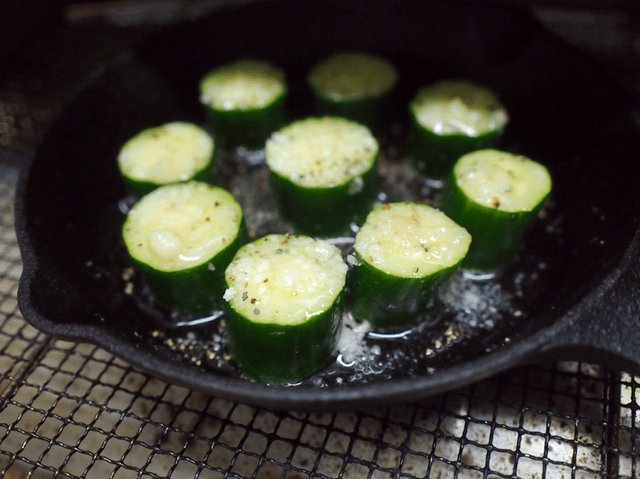 スキレットにきゅうりを並べる、(なければアルミホイル)