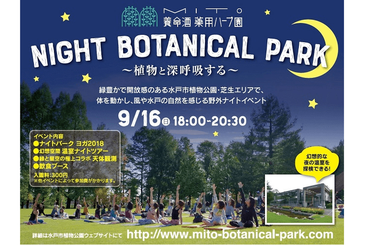 9月16日(日)18時から「水戸 養命酒薬用ハーブ園(水戸市植物公園内)」にて、同園初のナイトイベント「Night Botanical Park~植物と深呼吸する~」が開催されます。