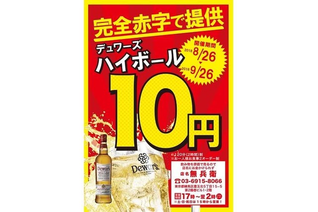 「飲み物を原価で売るので店名にお金かけられず店名 無兵衛(なしべえ)」では、2018年8月26日(日)~9月26日(水)の期間限定で、「デュワーズハイボール」を1杯10円(税別)で提供中です。