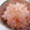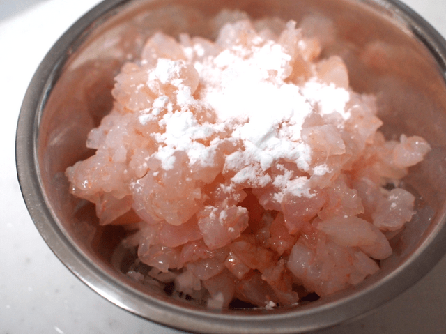 むき海老も細かく切る。(形は不揃いの方が食感があるので適当に切るのがポイント)