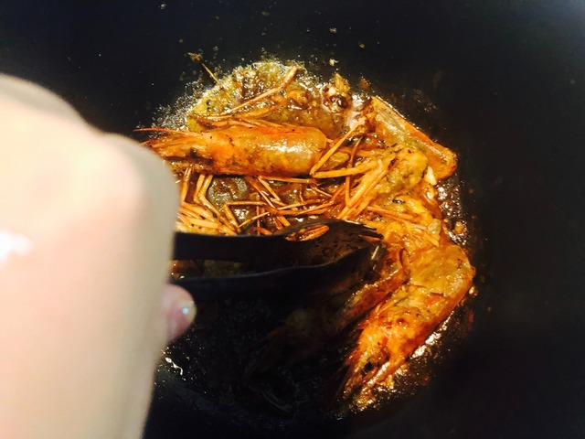 ポイント:エビのみそを押し出すように、時々潰しながら炒めていく。