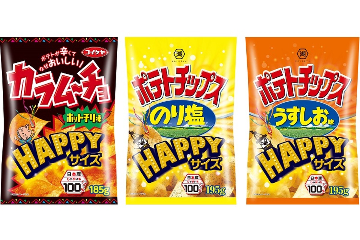 | 商品名・内容量 | 「HAPPYサイズ ポテトチップス のり塩」・195g 「HAPPYサイズ ポテトチップス うすしお味」・195g 「HAPPYサイズ カラムーチョチップス ホットチリ味」・185g |