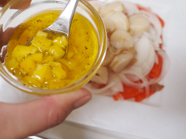 ホタテの貝柱を乗せたら、②のマリネ液をかける。