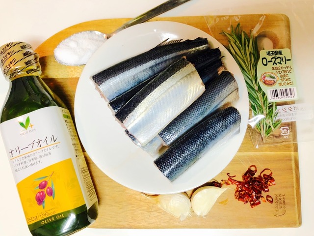 今回は食材をオイルに漬けてじっくりと火を入れる、コンフィにしてみました。この場合、すでに頭と内臓を取り除いてあるカット済みを使うと便利です。
