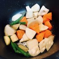 いったん鶏肉を取り出したら、オリーブオイル小さじ1を足し、同じ鍋で冷凍野菜ミックスを炒める。