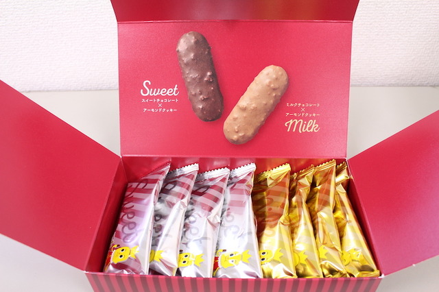 「ハッピーターン de chocolat」は「スイートチョコレート×アーモンドクッキー」と「ミルクチョコレート×アーモンドクッキー」の2種類入り。