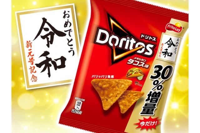 そんな「昭和」「平成」の時代で長年にわたり販売され続けてきた同ブランドから、「令和」への新たな時代への幕開けを祝い、「ドリトス メキシカン・タコス味」を30%増量した「おめでとう令和 30%増量バージョン」が発売になります。