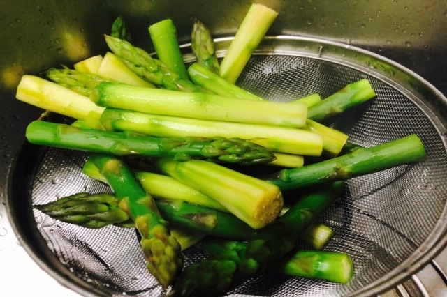 アスパラガスは根元の硬い部分の皮をピーラーで剥き、半分に切る。