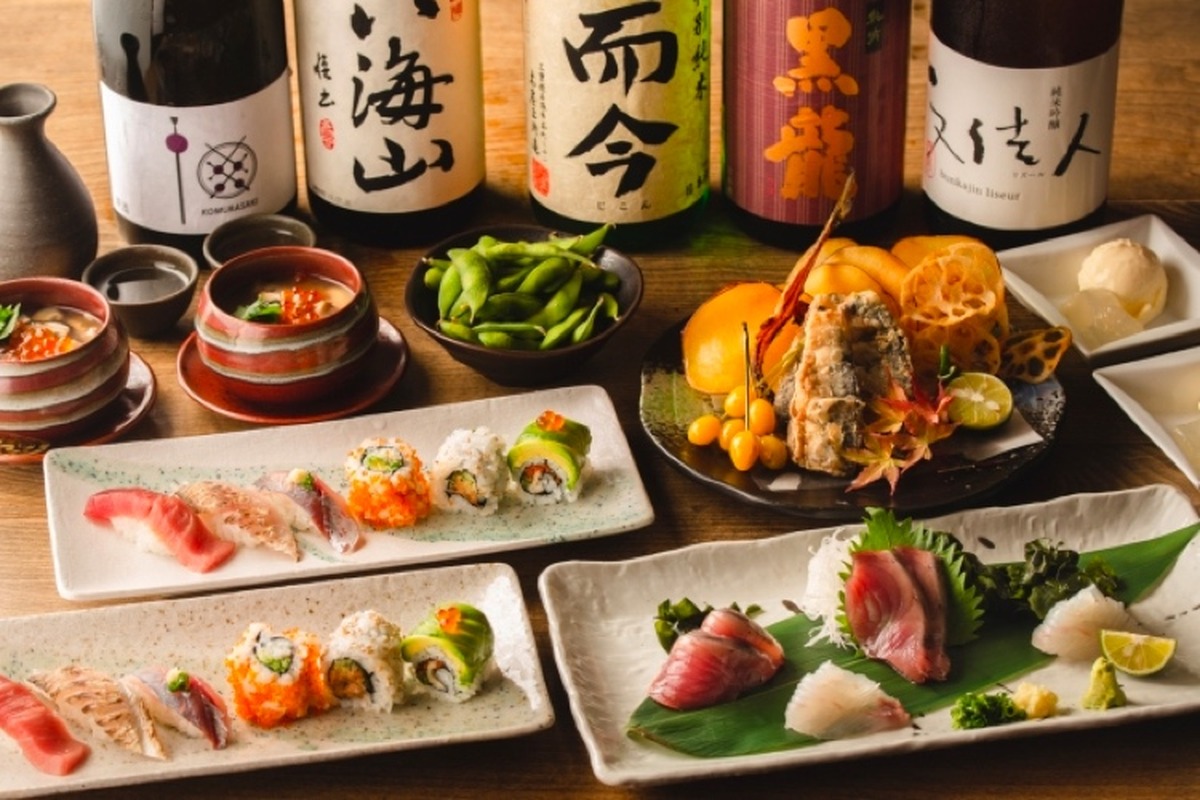 | コース内容 | 1.SUSHI×SAKE TERRACE COURSE 7,000円(税別) ・枝豆/お造り2種盛り/秋刀魚の竜田揚げと秋野菜チップス/イクラときのこ餡の茶碗蒸し/寿司盛合せ(握り3貫・インターナショナルロール3貫)/止め椀/デザート2.SNACK×SAKE TERRACE COURSE 4,500円(税別) ・軽食(枝豆/秋刀魚の竜田揚げと秋野菜のチップス/イクラときのこ餡の茶碗蒸し) ※1、2ともに2時間飲み放題付き(30分前ラストオーダー) |