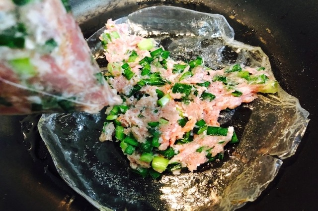 ジップロックの端を切ってタネを練りだし、スプーンなどで広げる。