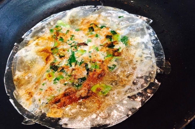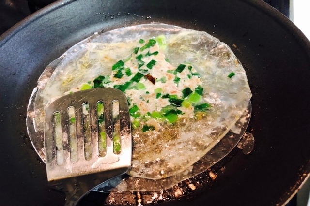 すぐに上からもう一枚ライスペーパーを重ね、フライ返しなどでおさえる。