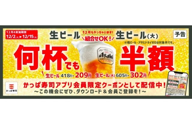 8月より毎月「生ビール半額キャンペーン」を、期間限定で開催しているという「かっぱ寿司」にて、12月も同キャンペーンが開催されます。