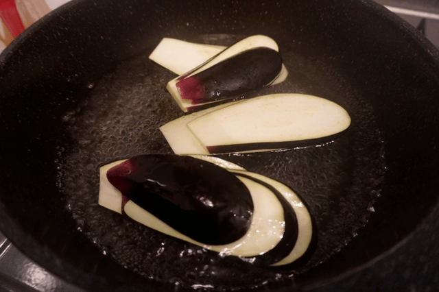 沸騰したお湯に分量外の少量のごま油を入れて、なすを入れる。