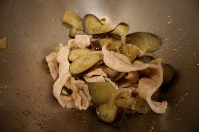 なすを茹でた鍋を弱火にして温度を下げたところに豚肉を入れて低温で茹でる。