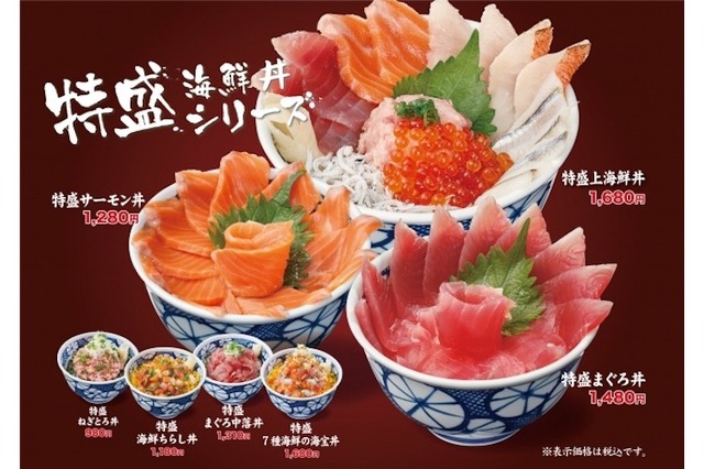 「特盛まぐろ丼1,480円」、「特盛上海鮮丼1,680円」などボリューム満点の海鮮丼に加え、海鮮丼22品・天丼3品の全25品が店内・テイクアウトにて利用できるのだそう。