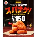 『スパナゲ!(スパイシーチキンナゲット)』は、ジューシーな鶏むね肉に、バーガーキング独自配合のチリパウダー、ペッパー、パプリカなどのスパイスを使用した、あとひく辛さが特長のチキンナゲットです。5ピースで150円とお得な価格で、単品での注文の他、バーガーのセットと一緒に手軽に楽しめる1品。