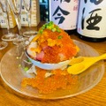 「鬼懸かってるこぼれ海鮮バクダン」は、真鯛や天然ブリ、ウニやいくらを器から溢れるまで盛りつけたというメニュー。新鮮なのはもちろんのこと、日本酒とのペアリングに最適で、「AKABU」などスッキリとした日本酒や、「景虎」などの重めの日本酒と相性抜群です。