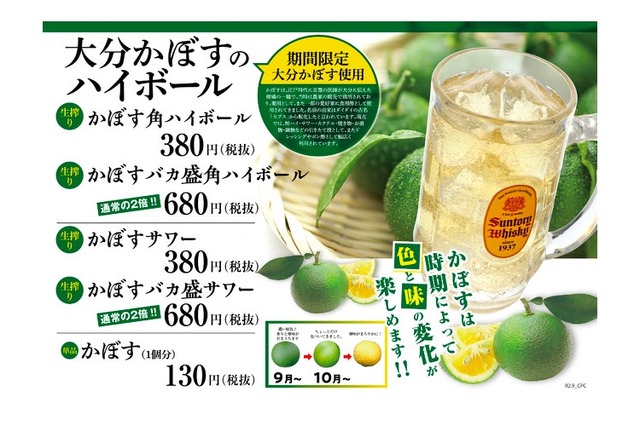 また、通常の2倍の量の「生搾り かぼすバカ盛(ばかもり)角ハイボール」「生搾り かぼすバカ盛(ばかもり)サワー」も各680円(税抜)でラインナップ。相性抜群だという、同日販売開始の「秋刀魚(サンマ)の塩焼き」といった料理と一緒に味わってみるのはいかがでしょうか?