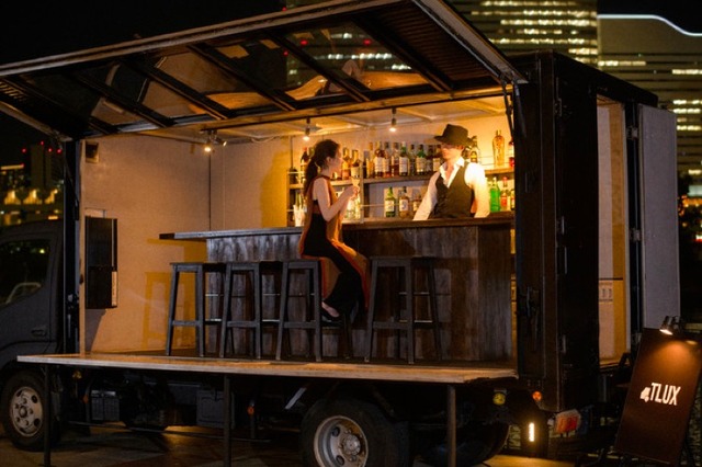 「BAR TRUCK MEDIA TLUX バートラックメディア・トラックス」は、トラックの店内に本格的なバーカウンターと客席を備えた、日本初の"動くバー"。